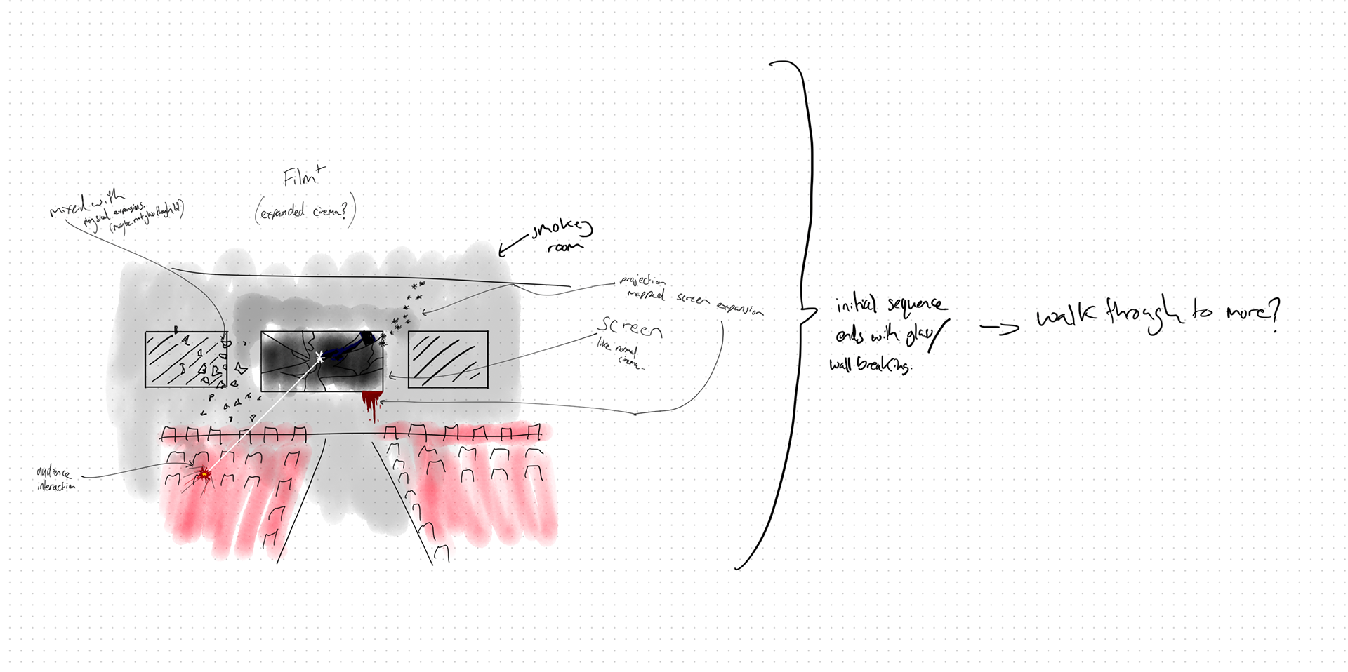 This project worked a little differently to usual, as instead of starting with a narrative idea, we started with a two-word brief: 'hybrid realities'. From here, we developed the concept of a film for multiple screens, using environments powered by Unreal Engine, and screened in a theatre with a live audience, incorporating performance elements into the installation. We next considered expanded cinema — almost like 3D cinema, but without the need for glasses. We could have smoke / sparks / insects / water / etc. physically come out of the screen, projected onto the walls and using haze machines and in-room lighting, with physical aspects (like blood capsules bursting and leaking out of the screen, or water leaking through) powered by Arduino. This is a (very rough!) sketch of how this could work, if we planted an audience member to be shot through the screen, breaking the forth wall in an extremely physical, performance-based way.